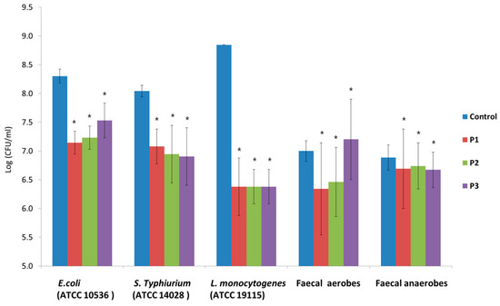 Number of pathogens and fecal isolates adhered to Caco-2 cells in the presence of and without apple pomace (P1, P2, and P3) ± SD. Data represent mean from four repeats in one experiment. Error bars denote SD. * Results significantly different from the unexposed control, ANOVA (p < 0.05).