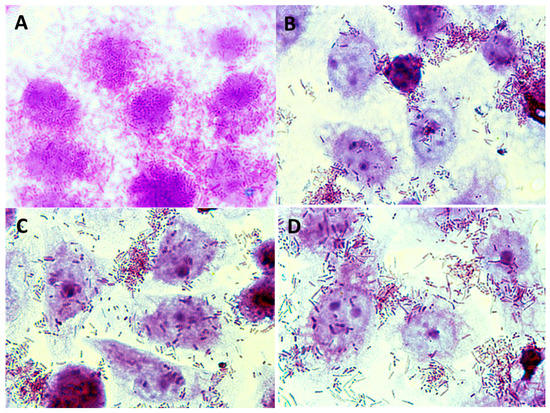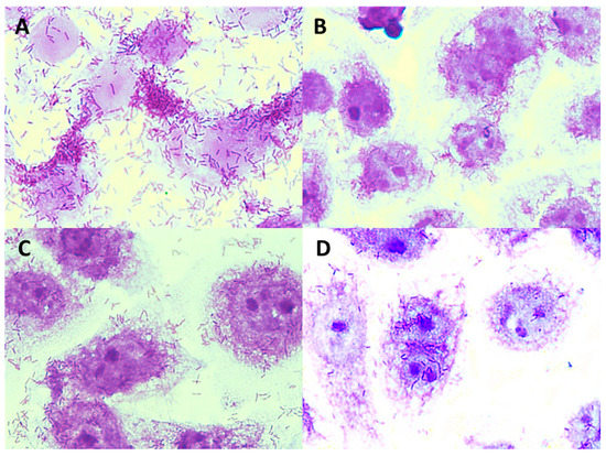Microphotographs (magnification × 1000) showing adhesion of L. monocytogenes ATCC 19115 to Caco-2 cells in the presence and without apple pomace hydrolysates: (A) L. monocytogenes ATCC 19115, (B) L. monocytogenes ATCC 19115 + P1 preparation, (C) L. monocytogenes ATCC 19115 + P2 preparation, (D) L. monocytogenes ATCC 19115 + P3 preparation. Stained with 0.5% crystal violet.