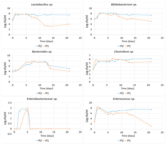 Higher number of Bacteroides after 21 days of fermentation was also observed in the P2 hydrolysate containing larger amounts of higher-order POS. Some Bacteroides sp. are known for their ability to degrade plant-derived polysaccharides in the gut and produce intermediates for energy. These bacteria have also been considered as candidates for new probiotics [24]. Bacteria of the Enterobacteriaceae sp. were inhibited after the fifth day of incubation and were not able to grow in the tested hydrolysates after six days. Enterococcus bacteria also exhibited decreasing growth rates after 12 days of fermentation of POS contained in P1 hydrolysate. Clostridium bacteria showed constant CFU number/mL during the incubation period in both the P1 and P2 hydrolysates.