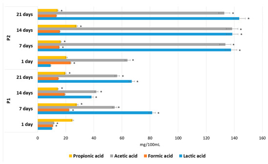 Short-chain fatty acids (SCFA) and lactic acid concentrations during in vitro fermentations in P1 and P2 media. Data represent mean from three repeats in one experiment. Error bars denote SD. * Significant differences between P1 and P2 hydrolysate for each fermentation period, ANOVA (p < 0.05).