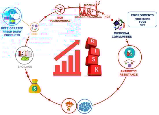 As further on discussed, although MDR in Pseudomonas spp. occurring in diary has not yet emerged as a public health threat, several ARGs have been identified in these species and some of the isolated strains have been recognized as MDR. The transfer of genetic material and ARGs through HGT among bacteria which inhabited the same ecological niche may lead to the spread of AR determinants to pathogenic agents, worsening their eradication from the processing environment, foods, and consumers (Figure 1).