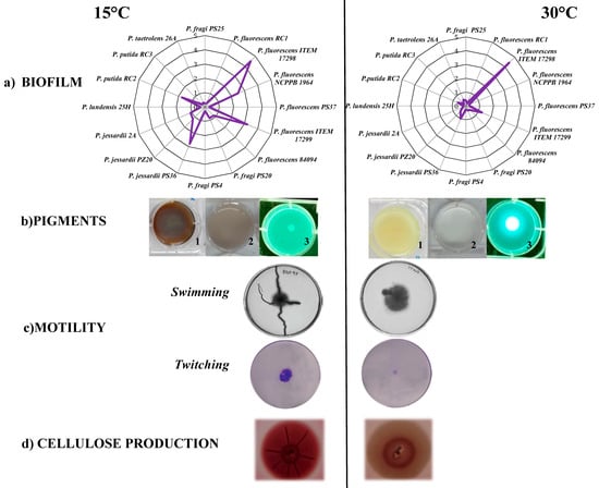 Phenotypic characteristics associated with biofilm formation by Pseudomonas spp., isolated from dairy cheese [20,41], under two temperatures of incubation (15 and 30 °C). (a) Radar plots of biofilm forming Pseudomonas spp. after 72 h of incubation at two temperature of incubation 15 and 30 °C. Values from 0 to 5 represent absorbance of Cristal Violet (CV) at 570 nm measured as reported by Quintieri et al. [21]; (b) Pigment production by P. fluorescens ITEM 17298 inoculated in Luria Bertani agar (1), M63 broth (2) and Pseudomonas Agar Base (3) after 48 h of incubation. For (3) resulting colonies were examined under Wood’s lamp; (c) Swimming and twitching motility of P. fluorescens ITEM 17298 inoculated on M8 with 0.3% or 1% of agar, respectively. For twitching biofilm formation on the bottom of plate dish was determined as previously described [21]; (d) Cellulose production (red crystals) by P. fluorescens ITEM 17298 on Congo Red Agar [147].