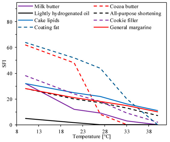 Solid fat index (SFI) profile of typical shortenings for bakery products. Notes: The SFI data was adapted from [25].