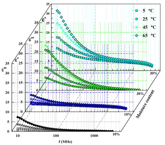 Dielectric heating is a fourth-generation heating treatment technology that is widely used for the industrial drying of food, agricultural products, and industrial materials [12,13]. When dielectric samples are subjected to a rapid reversal electric field, the electromagnetic wave passes through the material shell and interacts directly with the permanent or induced dipoles and charges inside the sample to induce underlying dipole polarization and ionic conduction with finite displacement, resulting in heat generation inside the volume [14,15]. However, to design and control the dielectric heating process, knowledge regarding the dielectric properties (DPs) of materials is essential, which can be used to determine how much polarization of dielectrics and charge conduction can occur and dissipate when subjected to an electromagnetic field [16]. The DPs of materials are normally described using the complex relative permittivity, ε*, which is represented as follows: ε* = ε′ – jε″. The real part (ε′) of the formula is named the dielectric constant, which reflects the charge storing capability of the material regardless of the sample’s size. The imaginary part (ε″) is named the loss factor, reflecting the energy dissipation in the material due to the conversion of the electromagnetic field into heat energy. The higher the dielectric loss factor values, the higher the electromagnetic energy that is absorbed and converted by the material, and the higher the rate of the temperature increase [17]. Therefore, DPs are the most basic parameters for characterizing the interaction, thermal efficiency, and penetration depth when designing MW and RF heating processes [18].