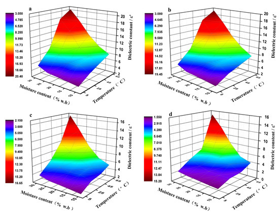 Three-dimensional representation of the dielectric constants of the pecan kernel as functions of the moisture content and temperature at frequencies of (a) 27, (b) 40, (c) 915, and (d) 2450 MHz.