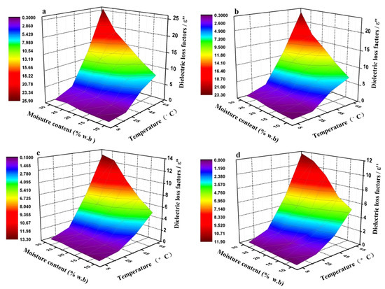The 3D plots of DPs at 27, 40, 915, and 2450 MHz are presented for pecan kernels with a moisture content range of 10−30% wb and a temperature range of 5–65 °C in Figure 2 and Figure 3. Overall, both the ε′ and ε′’ values of the pecan kernel samples in the RF range were significantly larger than those in the MW frequency range. At a certain frequency, an increase in the temperature and moisture content resulted in significant increases in ε′ and ε″, although the values increased more in the high temperature and moisture content range. For instance, at 27 MHz, when the moisture content increased from 10% to 30% wb, ε′ increased from 3.08 to 5.51 at 5 °C, from 6.67 to 18.01 at 45 °C, and from 8.09 to 20.39 at 65 °C. For the same moisture content and frequency, ε″ increased from 0.37 to 1.05 at 5 °C, from 5.15 to 13.06 at 45 °C, and from 7.85 to 25.86 at 65 °C. Compared with the values of the DPs in the RF range, the DPs at 980 and 2450 MHz (MW frequency) had much lower values for the same moisture and temperature levels. The same tendency has been observed at a given frequency in pistachio and peanut kernels [23,24], where the DPs at a high moisture content and temperature had significantly larger values than those at low moisture and temperature.
