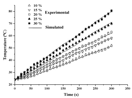 Figure 4 shows a comparison between the experimental and simulated temperature-time profiles of pecan kernels with five moisture contents of 10%, 15%, 20%, 25%, and 30% during 5 min RF heating with an electrode gap of 150 mm. It can be seen for all the tested samples that the simulation results using measured DP values accorded with experimental test temperature profiles at five moisture levels. Within the 5 min RF heating period, all heating curves were relatively linear, and the heating rates of pecan kernels increased significantly (p < 0.05) with increasing moisture content from 10% to 25%. However, the heating rate then decreased as the concentration increased from 25% to 30%. The 25% sample had the highest heating rate (11.2 °C /min). Similar trends were also found by Zhang et al. [23] for the heating rate of peanut kernels, in which the increase in moisture content resulted in increasing ε″, which in turn caused an initial increase and then a decrease in RF heating rates. Jiao et al. [38] reported that the maximum heating rate was reached when the values of ε′ and ε″ were close to one another.
