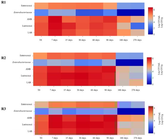 Heat maps depicting abundance of microbial groups characterizing the cheeses obtained with different rennets throughout ripening. Calf (R1), kid (R2) and pig (R3) rennets. Aerobic Mesophilic Bacteria (AMB); Lactic Acid Bacteria (LAB).