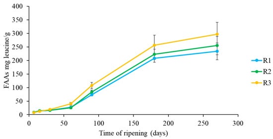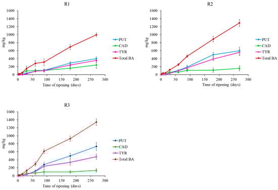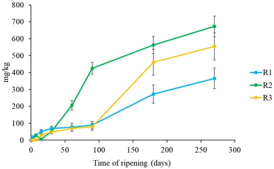 Figure 2 shows the evolution of FAAs during the ripening period. Obtained data revealed a certain variability of FAAs content among samples. The FAAs content increased significantly during ripening in all samples, reaching values of 233.74, 252.54 and 296.84 mg leucine/g in R1, R2 and R3 cheeses respectively after 270 days of ripening. This increase is in agreement with previous observations in Caciocavallo Pugliese, in Picante cheese, in Kashkaval cheese and in other Pecorino cheeses [,,,,]. The greater proteolytic activity in R3 cheeses was in agreement with Tofalo et al., (2015) [] who observed a higher proteolytic activity for pig rennet than for calf and kid ones. R3 cheeses contained the highest total concentrations of BAs (1293 mg/kg) (Figure 3). However, all the studied cheeses accumulated high total BAs contents even if with quantitative differences. It could be assumed that milk quality produced by the sheep in the Gran Sasso area is a relevant factor influencing the high BAs content of Pecorino di Farindola, probably also depending on the autochthonous microbiota [,].