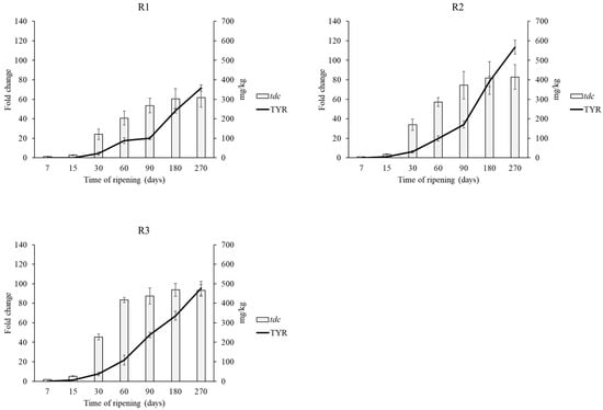 Tyramine presents several negative effects on human health such as headaches, migraine, neurological disorders, nausea, vomiting, respiratory disorders, hypertension [,]. However, even though histamine was considered as the most toxic BA for a long time, recently Linares et al. [] revealed that tyramine is even more toxic than histamine reporting the cytotoxicity threshold detected for histamine (441 mg/kg) and for tyramine (302 mg/kg). Amino acid decarboxylase activity is strain dependent rather than species specific, thus suggesting the occurrence of horizontal gene transfer events as part of a mechanism of survival and adaptation to specific environments []. Wüthrich et al. [] sequenced the histamine positive strain FAM21731 of L. parabuchneri showing that hdc gene cluster was located in a genomic island, transferred within this species. This species has been frequently reported in dairy products and is responsible for the accumulation of histamine in many types of cheeses [,,]. Its occurrence in milk is probably related to a contamination focus at farm level, because its capacity to adhere to stainless steel [,,]. Moreover, L. parabuchneri strains are able to develop and to produce histamine also at refrigeration temperatures, suggesting that when L. parabuchneri is present, refrigeration can only delay but not prevent the accumulation of histamine in cheese []. For this reason, aminogenic strains may be found within the contaminant species but also as part of the spontaneous fermentative microbiota. Therefore, the expression of tdc and hdc genes was checked by qRT-PCR. In all samples hdc gene was not upregulated confirming the absence of histamine in cheeses, whereas tdc expression increased over time in agreement with the increasing content of tyramine (Figure 4). The strongest increase in tdc expression was found in R3 cheese after 270 days of ripening (a 93-fold increase), whereas the other cheeses showed 61- (R1) and 82- (R2) fold increases of the tdc gene.