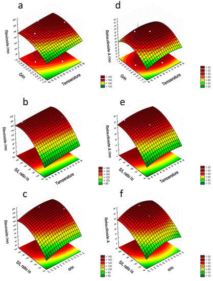 Finally, the regression models generated for stevioside and rebaudioside A concentrations were used to find the optimal value for the three extraction factors investigated: degree of grinding, temperature, and sample-to-solvent ratio. For this purpose, the relationship between independent and dependent variables was visualized in tri-dimensional representations of the response surfaces and bi-dimensional contour plots (Figure 1). These plots were obtained depicting two variables within the experimental range and keeping the third variable constant at the zero level (coded value corresponding to the central point of the experimental domain). As can be seen, the most dominant factor influencing the extraction of stevioside was the grinding of leaves. This factor had a quadratic effect with improved extraction of stevioside, while increasing the grinding until reaching a maximum level, after which a slight decrease was observed (Figure 1a). The sample-to-solvent ratio also caused a quadratic effect on the stevioside extraction similar to that observed for grinding, while the effect of temperature was linear, regardless of the grinding and S/L sample-to-solvent (Figure 1b,c). Using this model, the optimal extraction conditions for the stevioside were set as follows: temperature 99 °C, intermediate grinding level, and sample-to-solvent ratio 192. Under these conditions, the maximum extraction calculated using the RSM was 188.64 mg L−1. The effects of the experimental factors on rebaudioside A concentration were similar to those observed for stevioside (Figure 1d–f). In this case, the optimal conditions were: temperature 74.6 °C, very low grinding degree, and sample-to-solvent ratio 209 (maximum concentration calculated by RSM 36.12 mg L−1).