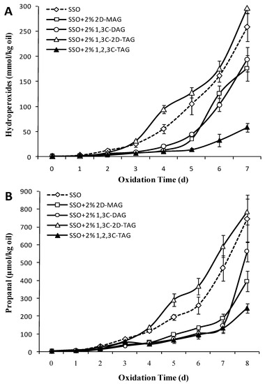 Studies have shown that the concentration of diacylglycerols in vegetable oils is between 0.8 and 5.8% of the total oil content [26]. Therefore, to determine the effect of monoglyceride and diacylglycerol on the oxidative stability of SSO, 2 wt% monoglycerides with DHA (2D-MAG), diacylglycerols with caprylic acid (1,3C-DAG), triglyceride with caprylic acid at sn-1,3 and DHA at sn-2 position (1,3C-2D-TAG), and caprylic triglyceride (1,2,3C-TAG), respectively, were added into the SSO. Hydroperoxide and propanal were used as monitoring indicators to study the effects of different structured lipids on the oxidation of SSO under accelerated oxidation (50 °C).