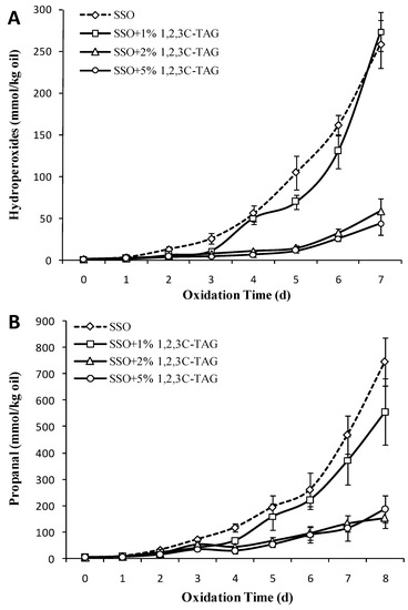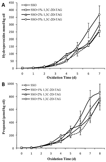 Raw soybean oil is highly susceptible to oxidation under accelerated conditions, owing to the presence of 7% α-linolenic acid and 50% linoleic acid. Figure 5A shows the effect of adding different amounts of 1,3C-2D-TAG on the oxidation of purified SSO. The POV began to increase on the third day with the addition of 1% 1,3C-2D-TAG. With increase in storage time, the change in POV content in the experimental group with 1% 1,3C-2D-TAG was basically identical to that in the SSO blank group (p > 0.05), indicating that addition of low doses of 1,3C-2D-TAG did not affect the oxidation process of SSO. However, the POV content of the group with high concentration of 1,3C-2D-TAG (5 wt%) was significantly higher than that of the SSO control group and the group with low concentration of 1,3C-2D-TAG (p < 0.05) from the third day, indicating that oil prepared with higher concentration of 1,3C-2D-TAG had lower oxidation stability. Rocha-Uribe et al. [34] demonstrated that the oxidative stability of lipids was related to CLA content and distribution of FA position, and the distribution of CLA at sn-2 sites was not conducive to the stability of the structured lipid. There are two main ways for degrading macromolecular FAs. One involves decarboxylation and decarbonylation, followed by C–C bond cleavage to produce hydrocarbon radicals or carbon ions; the other involves disruption of the hydrocarbons, followed by decarboxylation and decarbonylation to create short chain molecules. These two approaches compete with each other. Based on the DHA structure of the 1,3C-2D-TAG structured lipid at the sn-2 position, 1,3C-2D-TAG has partial polarity, and the probability of the exposure of unsaturated long chain of DHA in structured lipids is more. Therefore, the 1,3C-2D-TAG structured lipid is more likely to undergo decarboxylation and decarbonylation reactions after the bond cleavage of DHA hydrocarbons.