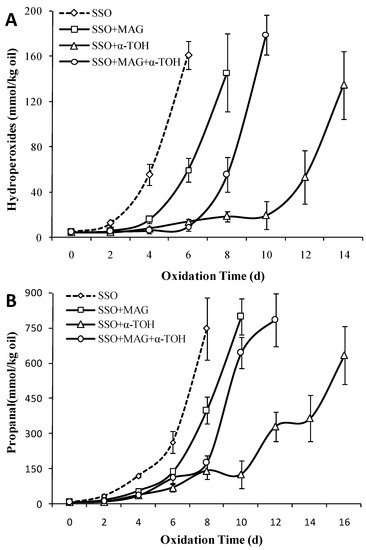 It was noteworthy that compared to that of the SSO blank group without 2D-MAG, the addition of 2D-MAG to α-tocopherol-supplemented-SSO lipid shortened the oxidation induction period of the lipid by 4 days, indicating that the addition of 2D-MAG promoted SSO oxidation. However, the addition of 2 wt% 2D-MAG to the SSO can also inhibit oxidation to some extent. Chen et al. [16] added 10 μm α-tocopherol to the system consisting of SSO and medium chain triacylglycerols (25:75 wt%) and the lag period was 11 days. After adding MAG, the lag period of the system was reduced to 10, 9, and 7 days (0.5, 1.5, 2.5 wt%), respectively, which also indicated that MAG in bulk lipid can reduce the antioxidant capacity of α-tocopherol [37]. As the effect of 2D-MAG on the SSO with/without antioxidants was significantly different, 2D-MAG and α-tocopherol had no effect on the inhibition and synergistic enhancement of SSO oxidation. Conversely, the addition of 2D-MAG reduced the inhibitory effect of α-tocopherol on SSO oxidation. Lee et al. [38] showed that although the addition of quercetin or rutin had an antioxidant effect in stripped oil, they promoted oxidation in non-stripped soybean oil. In this study, a potential possibility was that 2D-MAG in SSO inhibited oxidation mainly by itself oxidizing to avoid SSO from being oxidized.