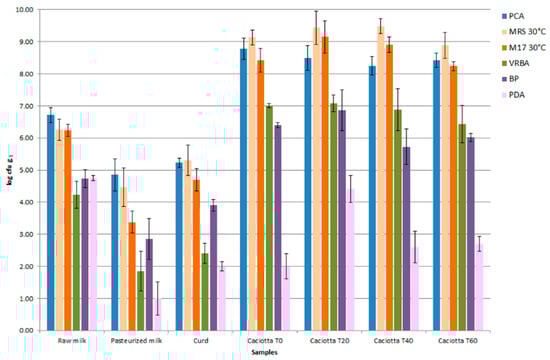 The starting raw milk used to manufacture both cheeses presented a numerous and heterogeneous microflora, with a prevalence of lactic acid bacteria (LAB) accounting for more than 106 log CFU/mL. Pasteurization of the milk caused a reduction of the microbial populations by approximately two decades. The prevalence of LAB, which are essential in cheese production, and the absence or low presence of spoilage and potentially pathogenic microorganisms such as enterobacteria, staphylococci, yeasts, and molds (responsible for spoilage) indicated good suitability of this milk for cheese-making.