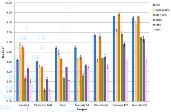 Twenty-five mL or g of each sample were dispersed in 225 mL of Quarter Strength Ringer’s Solution (Oxoid S.p.A., Garbagnate, Milan, Italy), homogenized, and serially diluted in sterile 0.1% buffered peptone water []. The appropriate dilutions were plated in triplicate on: (i) plate count agar (PCA, Oxoid S.p.A.) for counting of total aerobic bacteria, (ii) M17 (Oxoid) with 0.5% lactose (LM17) for Gram-positive cocci; (iii) Rogosa (Oxoid) or de Man, Rogosa and Sharpe (MRS) (Oxoid) for mesophilic Gram-positive bacilli; (iv) violet red bile agar (VRBA, Difco Laboratories, Detroit, MI) for coliforms; (v) potato dextrose agar (PDA, Difco) supplemented with chloramphenicol (0.1 g/L) for yeasts and molds and Baird Parker (BP, Oxoid) or mannitol salt agar (MSA, Oxoid) for staphylococci. PCA plates were incubated at 30 °C for 24 h, and LM17 and MRS dishes at 42 and 30 °C, respectively, for 48 h under anaerobic conditions (AnaeroGene, Oxoid S.p.A); VRBA and BP or MSA were incubated at 37 °C for 48 h and PDA plates at 25 °C for 7 days. Microbial analyses were performed in triplicate. Isolated colonies were randomly picked up from the highest plate dilutions of MRS, Rogosa, and LM17 agar and purified by repeated streaking on the relevant media. All isolates were characterized by Gram staining, catalase activity, spore formation, and gas production from glucose by the hot loop test []. All isolates were stored at −80 °C in MRS broth added with 20% sterile glycerol.