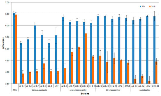 In Figure 4, the results of the acidification test on the selected autochthonous strains are shown. Lb. delbrueckii subsp. bulgaricus and most Lc. lactis strains were endowed with the best acidification activities. The fastest strains, able to reduce the pH values within three hours after the inoculum, were lactococci, although lactobacilli were the most acidifying after 24 h (Figure 4). A low acidifying activity was found in the Leuconostoc and Streptococcus strains tested.