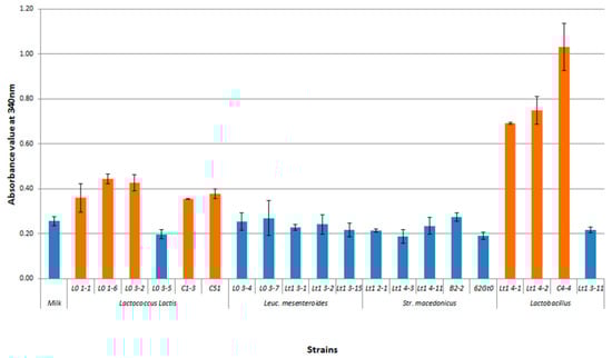 The most representative results of the analysis of the proteolytic activity of selected lactic acid bacteria are reported in Figure 5. Most strains did not develop significant proteolytic activities. In particular, no Leuc. mesenteroides and S. macedonicus strains produced absorbance values different from those of the control. Lb. delbrueckii subsp. bulgaricus showed the most proteolytic activity, while all the strains of Lc. lactis, with the exclusion of L03-5, showed significant proteolytic activity (Figure 5).