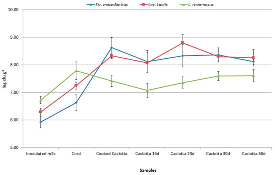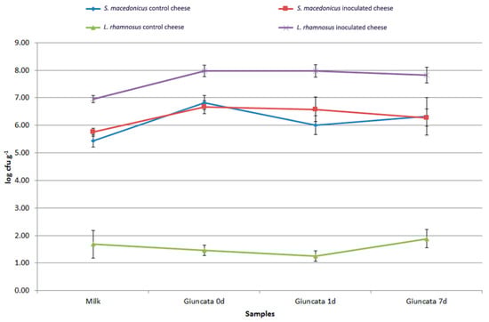 Giuncata Leccese is an un-ripened fresh cheese made from a blend of pasteurized sheep, cow, and goat milk. Giuncata is produced with milk heated to 72 °C, cooled to 32–38 °C, and coagulated in 25–30 min with the addition of calf or lamb liquid rennet without addition of a microbial starter. The curd is collected and drained into molds. Giuncata has no rind and the dough is white, with a soft and consistent texture, a mild acidic flavor, and a fine and intense odor of milk. As with other fresh cheeses, Giuncata is susceptible to the growth of spoilage microorganisms due to its oxygen content, high water activity, and neutral pH values []. Thus, in refrigerated storage, Giuncata has a shelf-life of only five days. However, inadequate hygienic conditions as well as occasional cold-chain interruptions may affect the final quality of this cheese, resulting in whey separation, increasing sourness and bitter taste. Thus, manufacturers need to standardize the production process of these traditional cheeses while still preserving their taste and sensory quality. To achieve these goals, the selection and use of autochthonous microbial strain cultures seems to be the best solution, as has already been reported [,,]. Moreover, given the increasing demand for foods providing consumer health benefits, probiotic cultures [] are being extensively exploited to add functional properties to traditional cheeses. In addition, these studies have also aimed to increase the market competitiveness of these cheeses, which has traditionally been based only on their sensory characteristics. However, as discussed by Di Lena et al. [], being strain-specific and affected by the intrinsic characteristics of each probiotic-delivering matrix, the survivability and functionality of a given probiotic strain should be assessed not only during the production and storage of each specific food, but also during digestion of the resulting probiotic food.