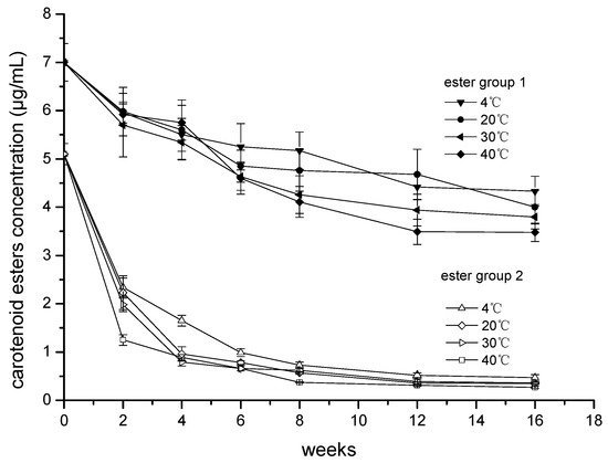 yt, is the carotenoid concentration at real time; y∞, is the theoretical concentration of carotenoid at infinite time. A1 and A2 represent the pre-exponential factors; α and β, are the observed rate constants for fast and slow degradation. Biexponential degradation of carotenoid indicated both irreversible (degraded into volatiles or epoxides) and reversible (isomerization) degradation were involved, and this degradation form was also observed during thermal treatment of carotenoid juices [15,29]. Ester group 2 was quickly decreased in the first four weeks at all storage temperatures (Figure 2), while ester group 1 was degraded gradually. Therefore, the storage time of ‘Cara Cara’ juice could be estimated by combining the degrading rates of ester group 1 and ester group 2 at each temperature, and this issue will be explored in our future research.
