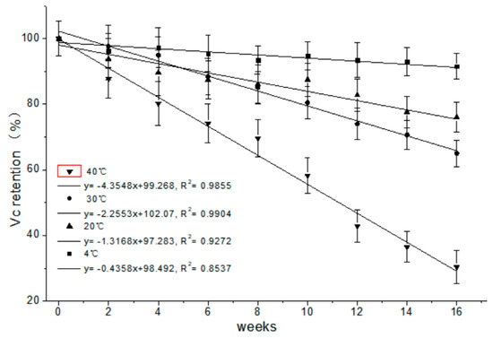 The percent retention of vitamin C in ‘Cara Cara’ juice during storage is shown in Figure 4, and vitamin C retention decreased with prolonged storage and increased temperature. No significant loss of vitamin C was detected in the ‘Cara Cara’ juice stored at 4 °C for 16 weeks. The concentration of vitamin C decreased by 23.93%, 35% and 69.58% respectively when ‘Cara Cara’ juice was stored at 20, 30 and 40 °C for 16 weeks. The degradation of vitamin C in citrus juice has been widely studied, and the degradation mode has been fitted to the first-order reaction [32,33]. A similar result was found in our study. The presence of vitamin C in citrus juice could protect carotenoids from oxidation, and a lower loss of carotenoid was confirmed in vitamin C fortified juice [34].