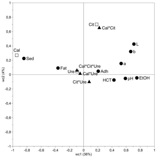 Partial least squares (PLS) for ultra-high temperature treated milk stored for 0-52 weeks at 4, 20, 30, and 37 °C. (□) factors, (▲) interaction terms, and (●) responses. The systematic variation in the data is to 36% and 4%, explained by the first and second principal components, respectively. Abbreviations: a = a*; Adh = fat adhesion; b = b*; Cal = calcium; Cit = citrate; EtOH = ethanol stability; Fat = fat separation; HCT = heat coagulation time; L = L*; Sed = sediment formation.