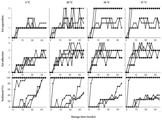 Storage time and storage temperature were not part of the full factorial designed model to evaluate the effects of calcium, citrate, and urea. However, it is know that storage temperature and storage time affect the stability of UHT milk [19]. Our results show that independent of storage temperature, storage time was closely connected to fat separation and fat adhesion, i.e., the longer the storage, the more fat was floating on the surface and adhering to the package (Figure 2). In agreement with Ramsey & Swartzel [1], our study showed that as storage temperature increases, fat separation increases, as explained by Stoke’s law. In the reference UHT milk stored at 4 °C, formation of sediment was visible after 24 weeks of storage and thereafter increased linearly, at 52 weeks after production covering the entire bottom of the package (100%) (Figure 2). Sediment formation limited the shelf-life of the UHT milk stored at 4 °C to 40 week, thereafter >45% of the bottom of the package was covered, and the milk was no longer acceptable for consumption. At 20, 30, and 37 °C, at the end of the storage time, the reference milk had sediment covering 40% of the bottom of the package, never reaching an unacceptable level.