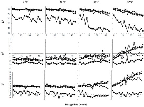 Variation in L* (lightness), a* (green-red), and b* (blue-yellow) in ultra-high temperature treated milk for selected samples with elevated levels of (■) calcium, (○) citrate, (∆) urea, (♦) calcium and citrate, and average values of two batches (×) unmodified reference ultra-high temperature treated milk during storage from 0–52 weeks at 4, 20, 30, and 37 °C.