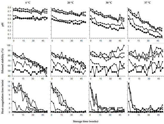 In the reference UHT milk stored at 4 °C, the pH more or less remained at its initial value of 6.7 throughout the 52 weeks of storage (Figure 4). In contrast, at 37 °C, pH values decreased linearly by 0.5 units during storage from weeks 0 to 52. Our results for changes in pH corresponded with a study by Al-Saadi and Deeth [45], who stored UHT milk for 12 weeks at 5, 20, and 37 °C, and found the pH decreased from 6.6 to 6.5 when stored at 37 °C. Small changes by 0.1 pH have been reported to result in large changes in heat stability [2,40,41]. The Maillard reaction, including the development of formic acid, proceeds faster at a higher storage temperature, explaining the differences in pH between storage temperatures [45], as well as the rapid decrease in HCT during storage at elevated temperatures.
