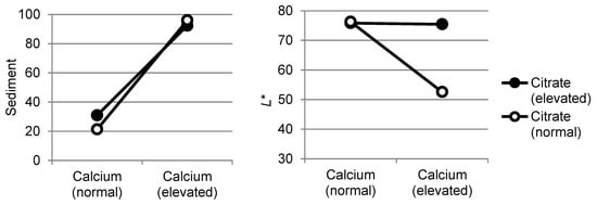 The interaction effects of calcium and citrate, for average values of all samples with normal and elevated levels, on sediment formation and L* (lightness) for ultra-high temperature treated milk stored for 0–52 weeks at 4, 20, 30, and 37 °C.