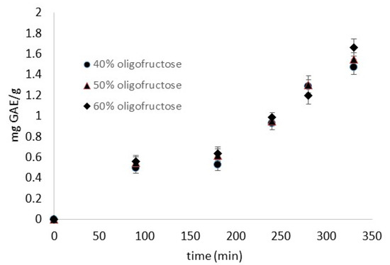 The impregnation of phenolics in the fish tissues during immersion in Rosa damascena by-product infusion, followed by the osmotic step (BP/OT procedure) is depicted in Figure 1, showing the significant enrichment of fish flesh with the desired phenolic compounds. However, the oligofructose concentration increase of the osmotic solution did not significantly affect (p < 0.05) phenolics impregnation, since in all cases, the final content achieved was approximately 1.5 mg GAE/g. Such a finding is considered advantageous, as the raw material reached a final phenolic content of 1500 ppm.