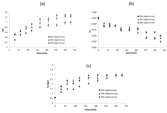 (a) Water loss (WL), (b) aw decrease, and (c) NaCl percentage of fish samples during OT at different concentrations of the osmotic solution. Error bars represent the ± standard deviation of measurements.