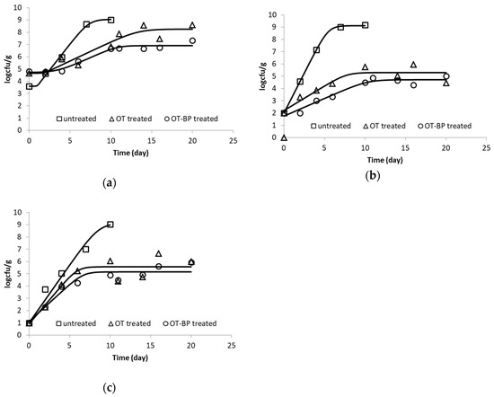 where Nt and No are the final (limit of acceptability) and the initial microbial population, tlag is the lag phase, and k is the relative growth rate (Table 1). Therefore, their shelf life was found to be 5 days for the untreated samples, 9 days for the OT treated samples, and 11 for the BP/OT-treated ones.