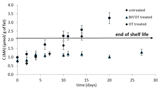 Regarding shelf life determination, the total lipid content of the studied cultured sea bass samples was determined, giving an average fat content of 5.2%. Assuming as acceptable a lipid oxidation level at the end of the shelf life being at 8 mg MA/kg fish flesh [44], and the estimated limit of 2.1 µmol MA/g of fat, one could graphically roughly estimate fish shelf life after the alternative treatments, namely 14 days for the untreated samples, 10 days for the OT-treated samples and a significantly longer time period (hardly distinguished by the plot) for the BP/OT-treated samples. Similarly, if the acceptability limit was set based on microbial spoilage and assumed to be equal to total viable count, reaching a level of 107 cfu/g (estimated when fish was organoleptically rejected by a preliminary sensory test and also reported in [25], for untreated (control) and OD-treated Sparus aurata fillets) with the incorporation of antimicrobial agents in the osmotic solution; then, the fish fillet shelf life could be estimated using the following equation (Equation (3)), according to [14,28]: