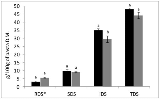 Results of in vitro digestion of pasta samples. RDS, rapidly digestible starch; SDS, slowly digestible starch; IDS, inaccessible digestible starch; TDS, total digestible starch. Black bars, CP and grey bars, SP. Different letters (a, b) for the same starch fraction denote a statistically significant difference between samples at p ≤ 0.05.