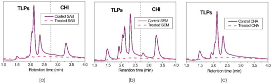 HPLC chromatograms of wines before and after treatment with acrylic acid plasma coated magnetic nanoparticles (a) Sauvignon blanc, (b) Semillon and (c) Chardonnay wine; (thaumatin-like proteins (TLPs), chitinases (CHI)).