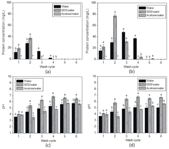 Protein concentration in the supernatant as a function of wash cycle for: (a) bare MNPs and (b) plasma-coated MNPs; pH of the supernatant as a function of wash cycle for: (c) bare MNPs and (d) plasma-coated MNPs. * The amount of protein was not measured in pure acetone due to insolubility and/or incomplete recovery from the solvent. Significant differences between solvents on protein removal or pH was assessed by Student’s t test at each wash step. Mean values with a different letter indicate significant differences (p < 0.05).