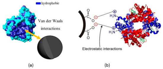 Schematic of a possible mechanism for protein adsorption (a) on the bare magnetic nanoparticle surface and (b) on acrylic acid plasma coated magnetic nanoparticle surface.