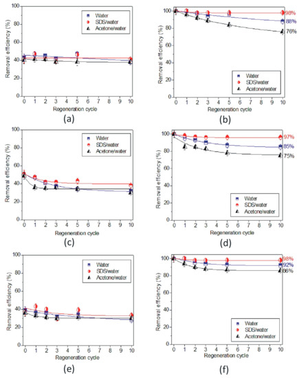 In contrast to what was observed for bare MNPs, acrylic acid plasma polymer coated MNPs more efficiently removed wine protein, as was discussed previously (Figure 4b,d,f). The percentage of protein removal in relation to the regeneration cycles for coated MNPs decreased gradually for all three cleaning solvents (R2 for fittings are provided in Table S2 in Supplementary Material). The 10% SDS solution was the most effective solvent in the regeneration of MNPs and retained the protein removal efficiency after the tenth regeneration cycle for all three wines. Removal percentages were 98%, 97% and 98% of protein removal for the Sauvignon blanc, Semillon and Chardonnay wines at the final regeneration step, respectively. Additionally, cleaning the surface of coated MNPs with Milli-Q water alone resulted in the retention of a high protein removal efficiency: at 88%, 85% and 92% after the tenth regeneration cycle for SAB, SEM and CHA wine, respectively. The least efficient solvent was acetone with 76%, 75% and 86% protein removal from SAB, SEM and CHA wine, respectively, at the tenth regeneration cycle (for statistical analysis, please refer to Supplementary Material Tables S3–S8).