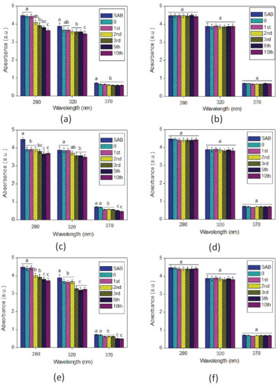 Absorption in the spectral range of 280 to 420 nm was measured to compare the phenolic content in wines before and after treatment with MNPs. Figure 5a,c,e shows the spectral fingerprints of SAB wine before and after treatment with bare MNPs. The 280 and 320 nm wavelengths give an indication of the concentration of total phenolics [27], and low molecular weight phenolics such as hydroxycinnamates [28] and flavanols are detected at 370 nm. As presented in Figure 5a,c,e, there were differences in phenolic composition for control wines in comparison with wine after treatment with MNPs regardless of the cleaning solvent used. A decrease in absorbance values was observed when wine was treated with bare MNPs. The results suggest that phenolics can potentially bind to bare MNPs. Phenolic content was also measured for SEM and CHA wines treated with bare MNPs. As shown in the Supplementary Material (Figures S1 and S2), similar trends were observed for SEM and CHA wines treated with bare MNPs as found for the SAB wines.