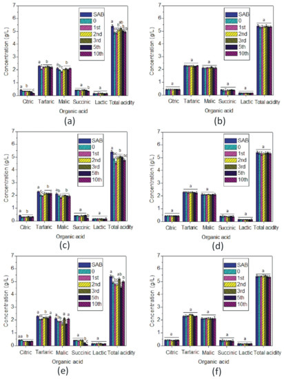 Organic acids concentration of Sauvignon blanc wine before and after treatment with bare and acrylic acid plasma coated magnetic nanoparticles. Three cleaning solutions were used: (a,b) Milli-Q water, (c,d) SDS and (e,f) acetone. Data significance was assessed by Student’s t test. Mean values with a different letter were significantly different (p < 0.05).
