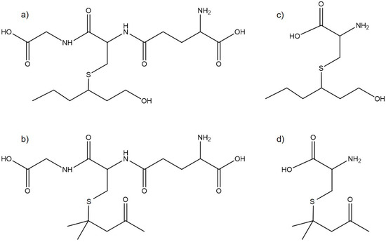 Chemical structure of thiol precursors. (a) 3-S-glutathionyl mercaptohexan-1-ol (GSH-3MH), (b) 3-S-glutathionyl mercapto-4-methyl-pentan-2-one (GSH-4MMP), (c) 3-S-cysteinyl mercaptohexan-1-ol (Cys-3MH), and (d) 3-S-cysteinyl mercapto-4-methyl-pentan-2-one (Cys-4MMP).
