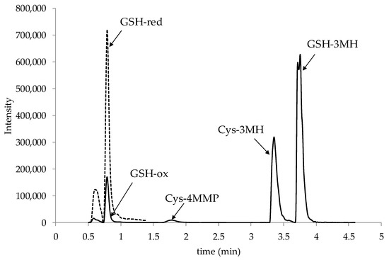 - Concejero, B.; Peña-Gallego, A.; Fernandez-Zurbano, P.; Hernández–Orte, P.; Ferreira, V. Direct accurate analysis of cysteinylated and glutathionylated precursors of 4-mercapto-4-methyl-2-pentanone and 3-mercaptohexan-1-ol in must by ultrahigh performance liquid chromatography coupled to mass spectrometry. Anal. Chim. Acta 2014, 812, 250–257. [Google Scholar] [CrossRef] [PubMed]