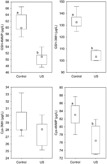 The results distribution, split by treatment and precursor, are shown in the box plots of Figure 3. The mean concentrations (n = 5) of GSH-3MH, GSH-4MMP, Cys-3MH, and Cys-4MMP in control samples was 133 ± 7, 62 ± 4, 29 ± 2, and 84 ± 5 µg/L, respectively, and 104 ± 4, 50 ± 3, 28 ± 2, and 77 ± 4 µg/L after the US treatment. The analysis of the variance (Fisher LSD test; p < 0.05) found significant differences between treatments with regards to GSH-3MH, GSH-4MMP, and Cys-4MMP, confirming the interaction of US and thiol precursors. The reduction of the concentration was higher on average on glutathionylated than on cysteinylated forms: ~−22.4% and ~−18.0% for GSH-3MH and GSH-4MMP, respectively and~−5.6% and ~−7.6% for Cys-3MH and Cys-4MMP. This situation is in accordance with the results found in grapes, where the concentration of GSH-3MH was the one that was found to be reduced after treatment. The breakage of the compounds would be possibly related to the radical and electrontransfer processes generated by the high energy and excited state species created in the solution following cavitation. The mechanism of the cleavage and the degradation products do not make part of the present work and specific studies should be performed. Nevertheless, from a sensory point of view, precursors are key molecules in the aroma of certain wines, insofar as volatile thiols released during fermentation present extremely low odor thresholds. Thus, in case the precursor cleavage occurs, the release of 3MH and 4MMP should represent the most important reaction products in winemaking.