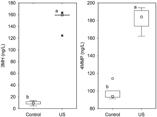 Concentration distribution of 3-mercaptohexan-1-ol (3MH) and 4-mercapto-4-methyl pentan-2-one (4MMP) in the model solution in control and treated (US) samples after 5 min of sonication. Different letters indicate mean values statistically differentiated. * Outliers.