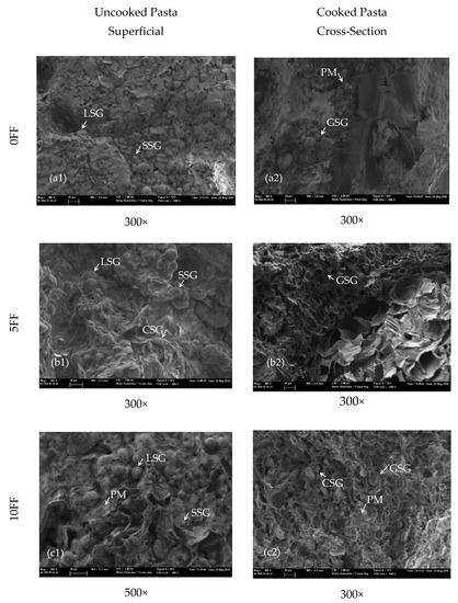 SEM observations of the 0FF, 5FF and 10FF pappardelle (magnification 300 and 500×): (a1–c1) uncooked samples; (a2–c2) cooked samples. LSG–large starch granules; SSG—small starch granules; CSG—coated starch granule; GSG—gelatinised starch granule; PM—protein matrix.
