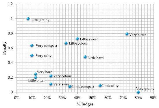 Graph of the penalties of the studied attributes on the ideal point scale.