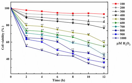 H2O2 is generated in the mitochondrial respiratory chain and produced by the disproportionation effect of O2- [,,]. The hydroxyl radical could be quickly offered by H2O2 in Fenton chemical changes. The hydroxyl radical is one of the most common free radicals, which will induce lipid oxidation, bio-macromolecule damage, lead to mitochondrial dysfunction and calcium imbalance, and cause cell apoptosis. Therefore, it is the key to select the appropriate concentration and acting time of H2O2. The activity of the NCTC-1469 cells is evaluated using CCK-8 analysis, and the results showed the number of living cells gradually decreased when the concentration and time of H2O2 increased in Figure 1. When the H2O2 concentration was from 500 to 1000 μΜ, cultivated with all times, the percent of living cells significantly decreased (** p < 0.01). It is worth noting that when the concentration was 500 μΜ and the action time was 4 h, 25.0% of the cell viability was inhibited, which was expressed as a decrease in cell activity with a significant difference (** p < 0.01). Therefore, 500 μΜ was regarded as the optimal concentration of our model group and 4 h as the optimal induction time.