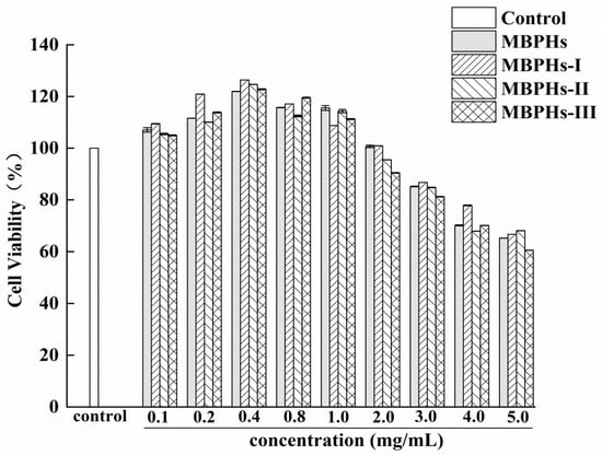 NCTC-1469 cells in logarithmic growth were seeded in a 96-well plate at a concentration of 1 × 105 cells/mL. After 12 h of cultivation, the cell medium was removed. The cells were treated with various concentrations of the MBPHs, MBPHs-I, MBPHs-II and MBPHs-III (0.1, 0.2, 0.4, 0.8, 1.0, 2.0, 3.0, 4.0, 5.0 mg/mL). Then the medium was added to 200 μL. After 12 h, the medium was removed and the 96-well plate with the fresh medium was washed twice. Finally, the cell was adding 100 μL of new cell medium and 10 μL of CCK-8 solution and cultured for 1 h, the absorbance was measured at 570 nm.