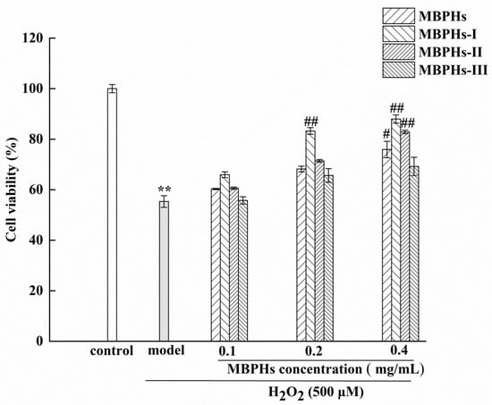The protective effect on the viability of H2O2-induced NCTC-1469 cells was determined using the CCK-8 solution. As shown in Figure 3, the viability of the cells decreased significantly after culturing with H2O2 for 4 h compared with the control group (p < 0.01). After adding MBPHs, MBPHs-I, MBPHs-II, and MBPHs-III, the viability of the cells increased to varying degrees. When the dose was 0.4 mg/mL, the cell survival rates of the four components were 78%, 86%, 83%, 74%, respectively. The protective effect of MBPHs-I in the cells induced by H2O2 was higher than that of other components, and the intensity was MBPHs-I > MBPHs-II > MBPHs > MBPHs-III. In addition, there was a dose-dependent relationship between cell viability and the concentrations of every protein hydrolysate. Therefore, we further studied the anti-oxidation effects of MBPHs-I and MBPHs-II.